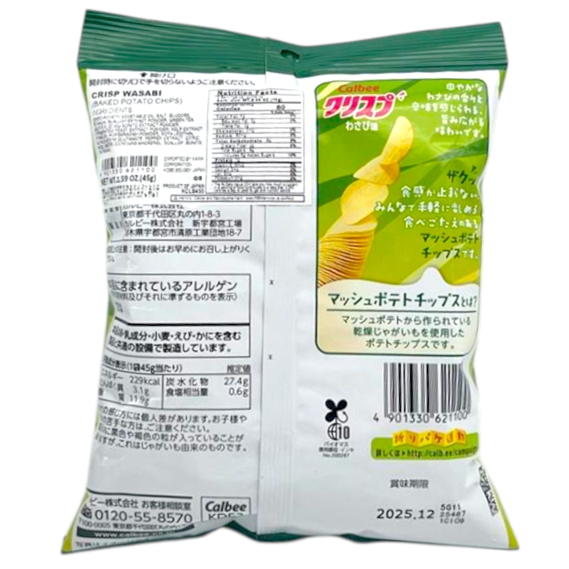 Calbee Crisp Wasabi Potato Chips 1.59 oz deliver a bold and zesty snacking experience with the fiery kick of wasabi perfectly balanced over crispy potato chips. Each bite combines heat and crunch for a uniquely flavorful snack.
