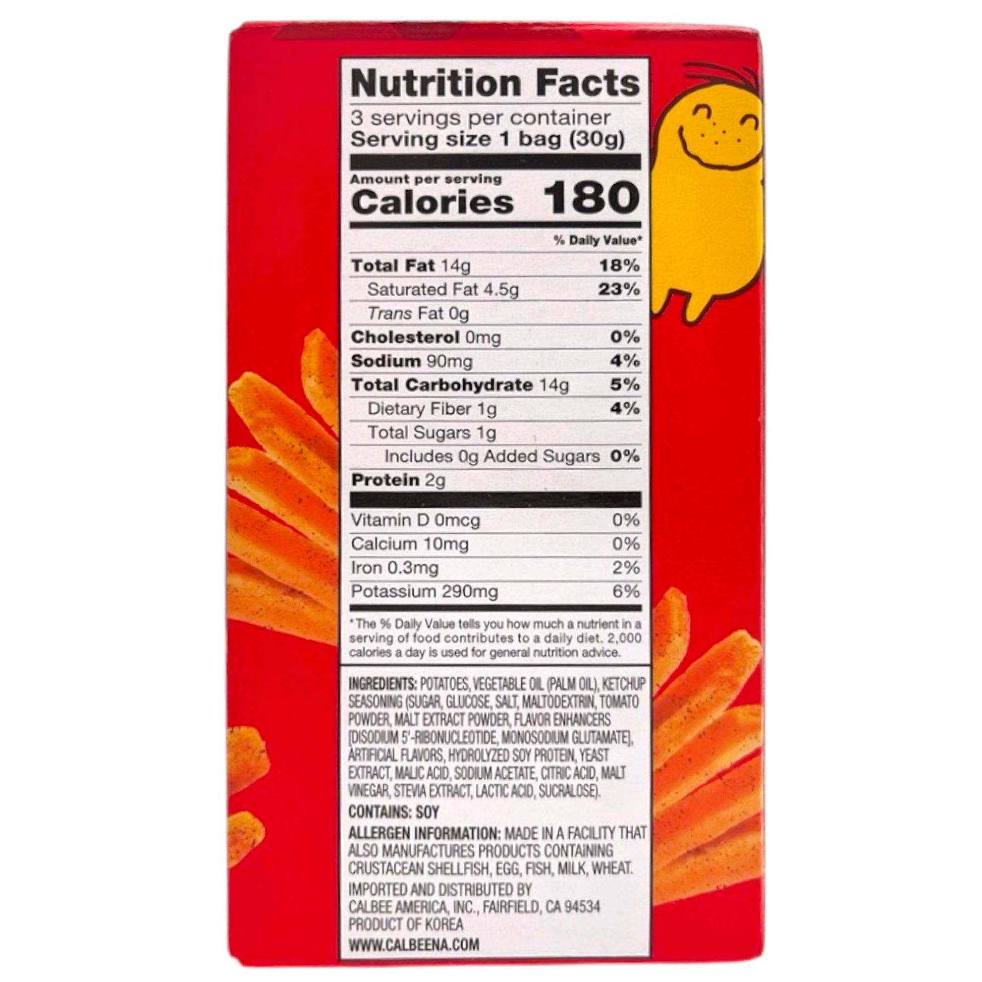 Calbee Jagabee Potato Snack Ketchup 3 Bags 3.18 oz features crispy potato sticks with a tangy ketchup flavor. Made from real potatoes, these snacks deliver a satisfying crunch and a savory-sweet taste in every bite.