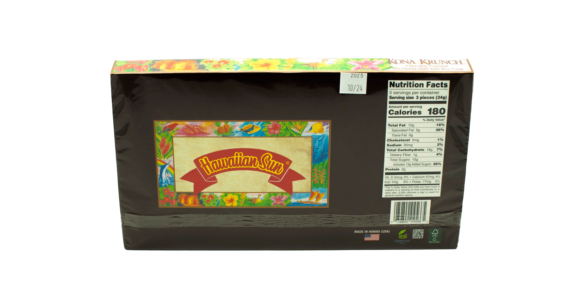 Hawaiian Sun Kona Krunch Chocolate Covered Macadamia Nuts with Rice Crisp offers a delicious combination of buttery macadamia nuts, smooth milk chocolate, and crispy rice for a unique texture and flavor experience. This treat is a delightful fusion of creamy, crunchy, and nutty elements, perfect for snacking or gifting.