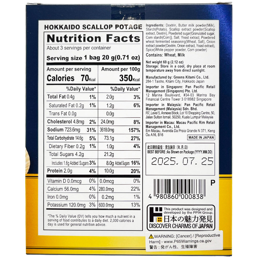 Jonetz Hokkaido Scallop Potage 2.12 oz is a delicious and creamy soup mix that brings the taste of Hokkaido's fresh scallops into a rich and comforting potage.