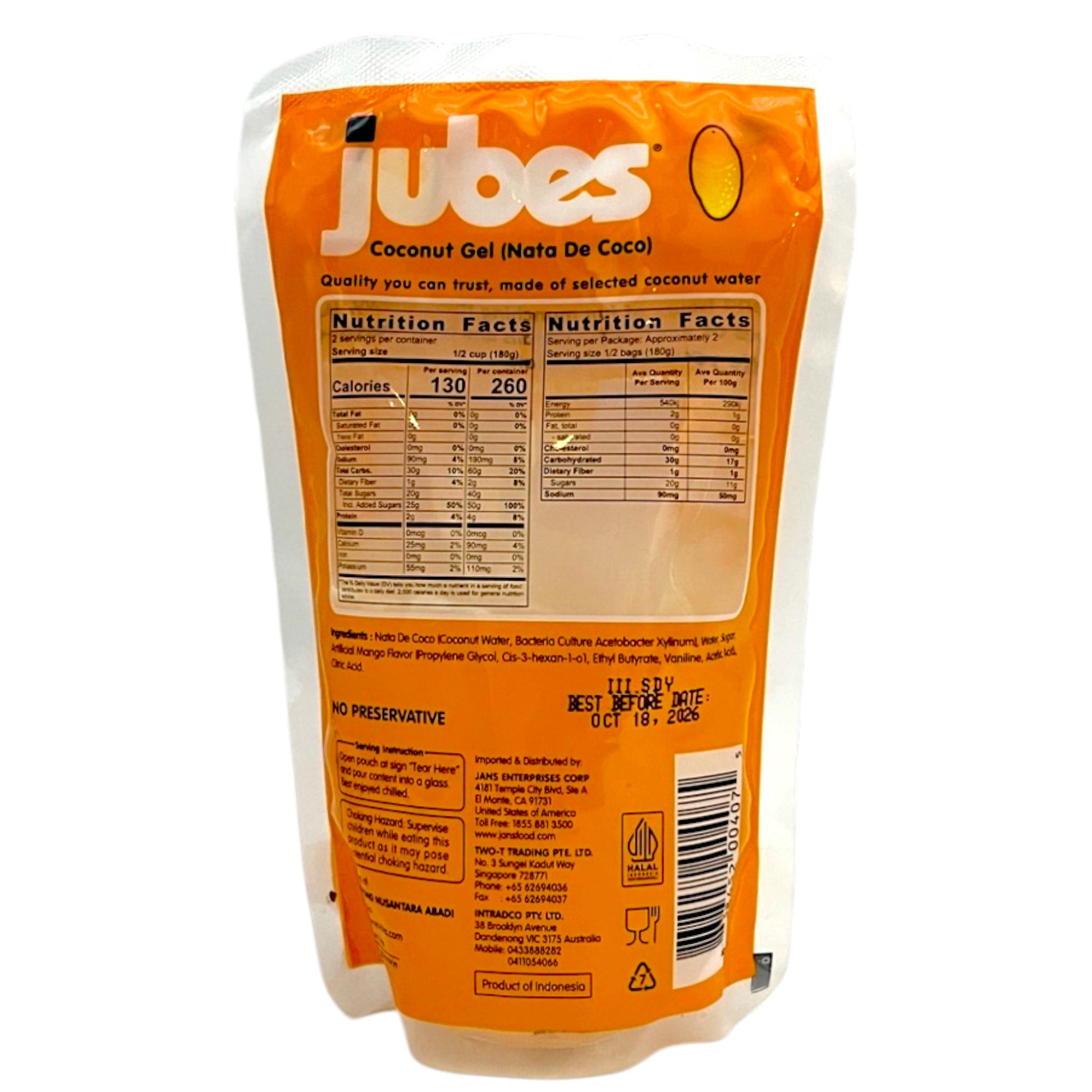 Jubes Nata de Coco Mango 12.7 oz is a refreshing tropical treat featuring chewy nata de coco cubes in a sweet mango-flavored syrup. This ready-to-enjoy dessert is perfect for a quick snack, topping for shaved ice, or mixing into drinks for added texture and flavor.