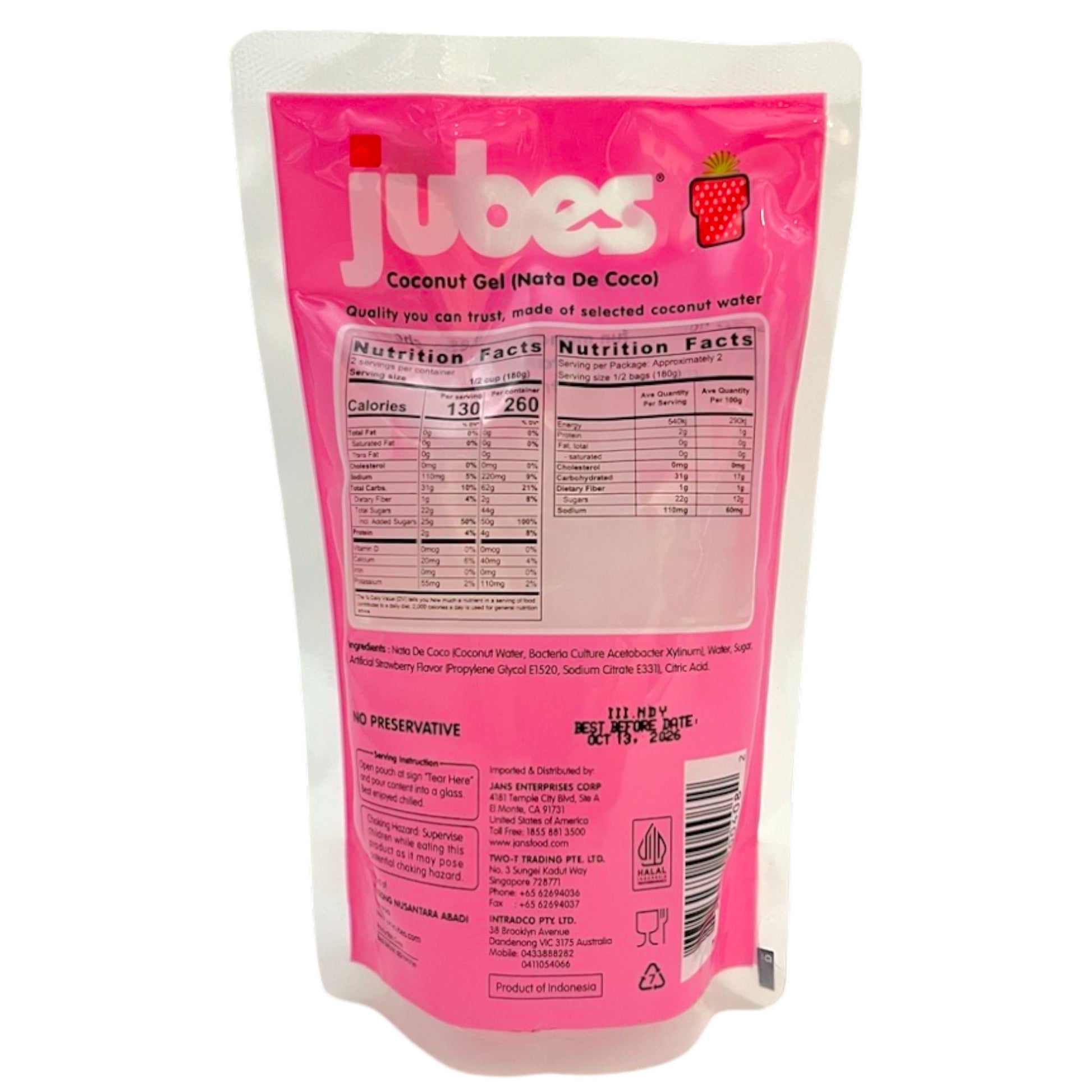 Jubes Nata de Coco Strawberry 12.7 oz is a fruity twist on the classic coconut gel snack. Featuring chewy nata de coco cubes infused with sweet strawberry flavor, this refreshing treat is perfect for enjoying on its own or adding to your favorite desserts and drinks.
