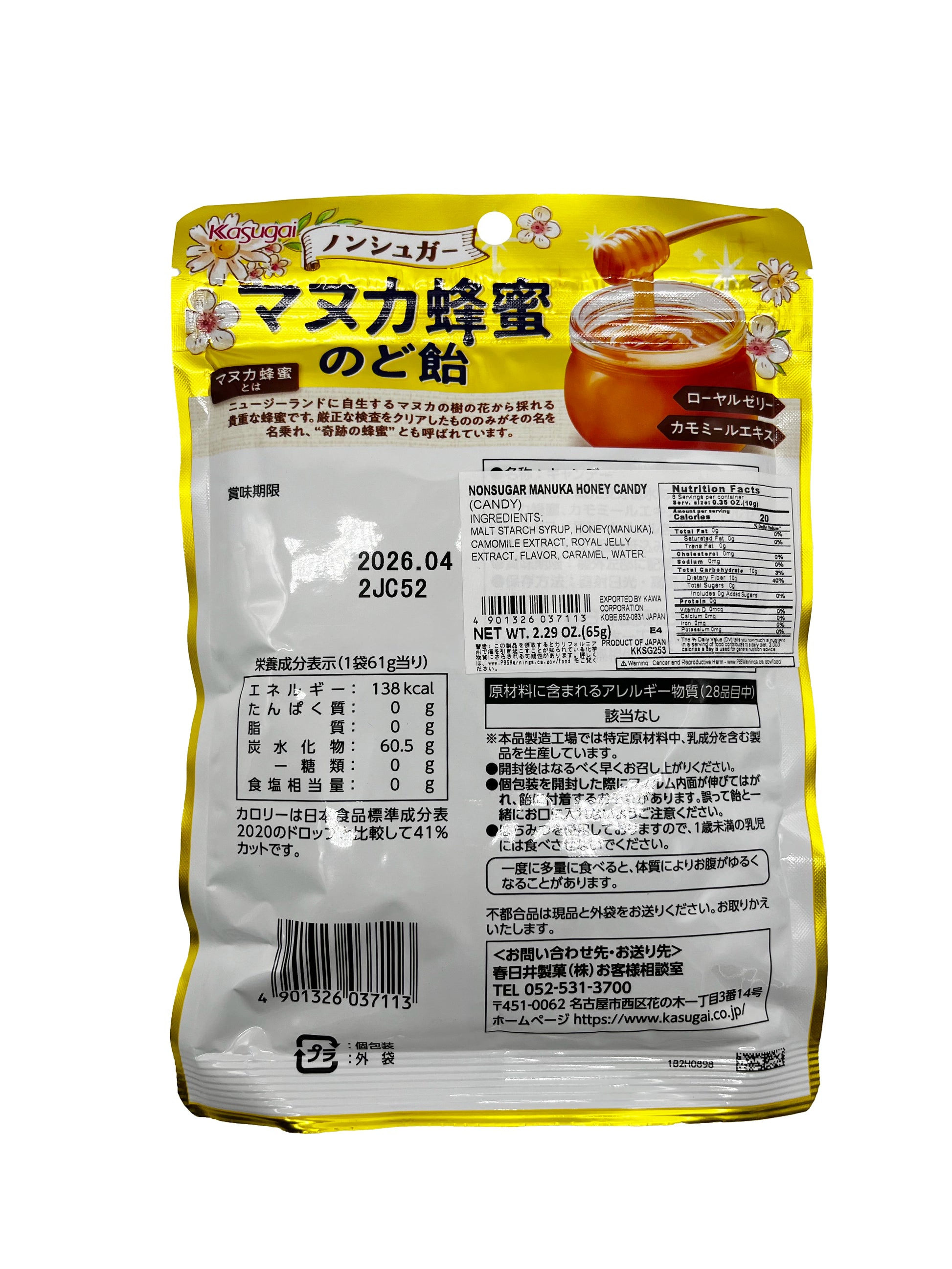 Kasugai Non-Sugar Manuka Honey Nodo Ame Candy is a unique and health-conscious treat that combines the soothing properties of Manuka honey with a delightful, chewy texture. Each 2.29oz bag contains individually wrapped candies, making them perfect for on-the-go enjoyment or sharing. These candies are crafted without added sugar, allowing you to enjoy the natural sweetness and health benefits of Manuka honey. With a smooth, honey-like flavor that melts in your mouth, they are ideal for a sweet pick-me-up or a soothing snack. Enjoy the comforting taste and benefits of this delicious, guilt-free candy!