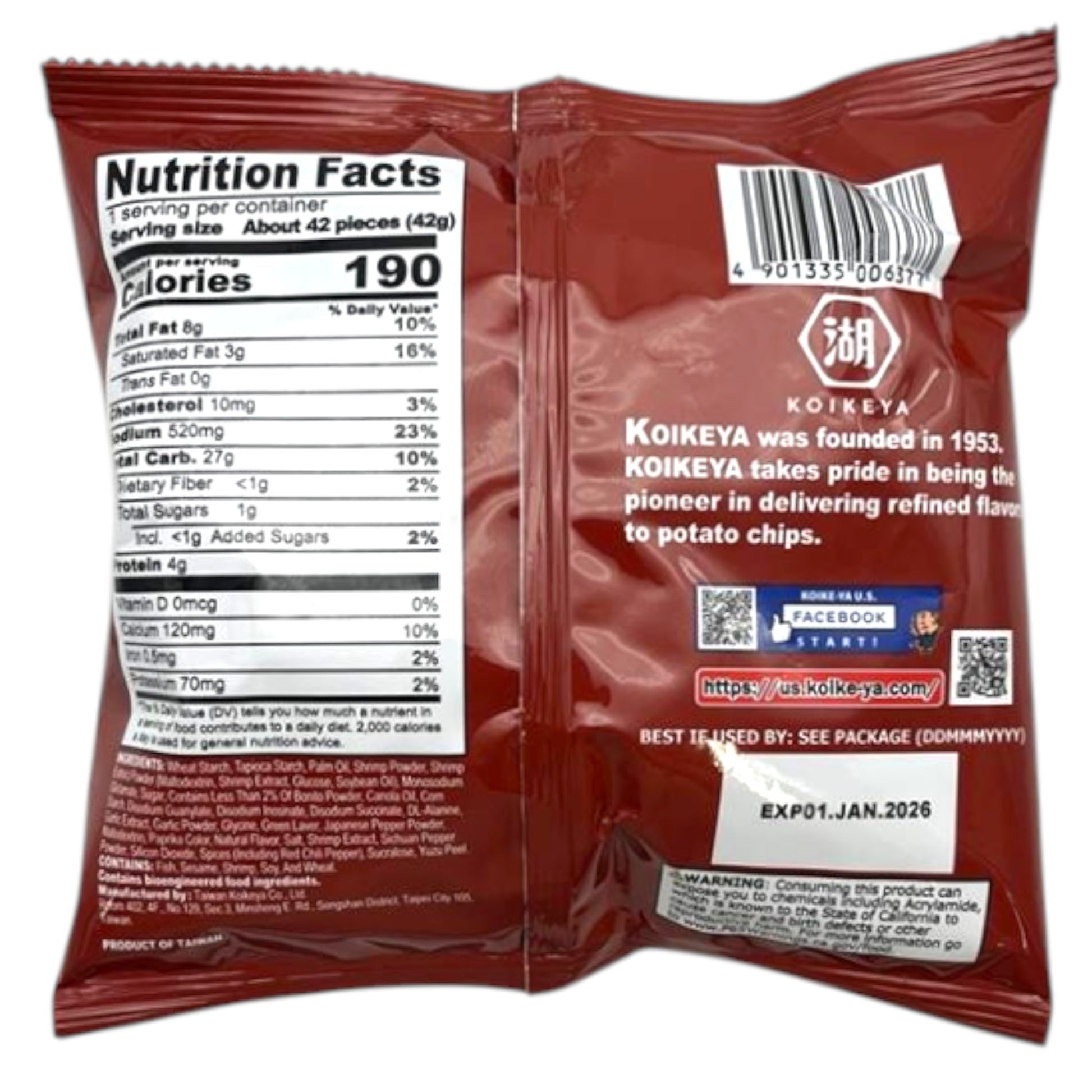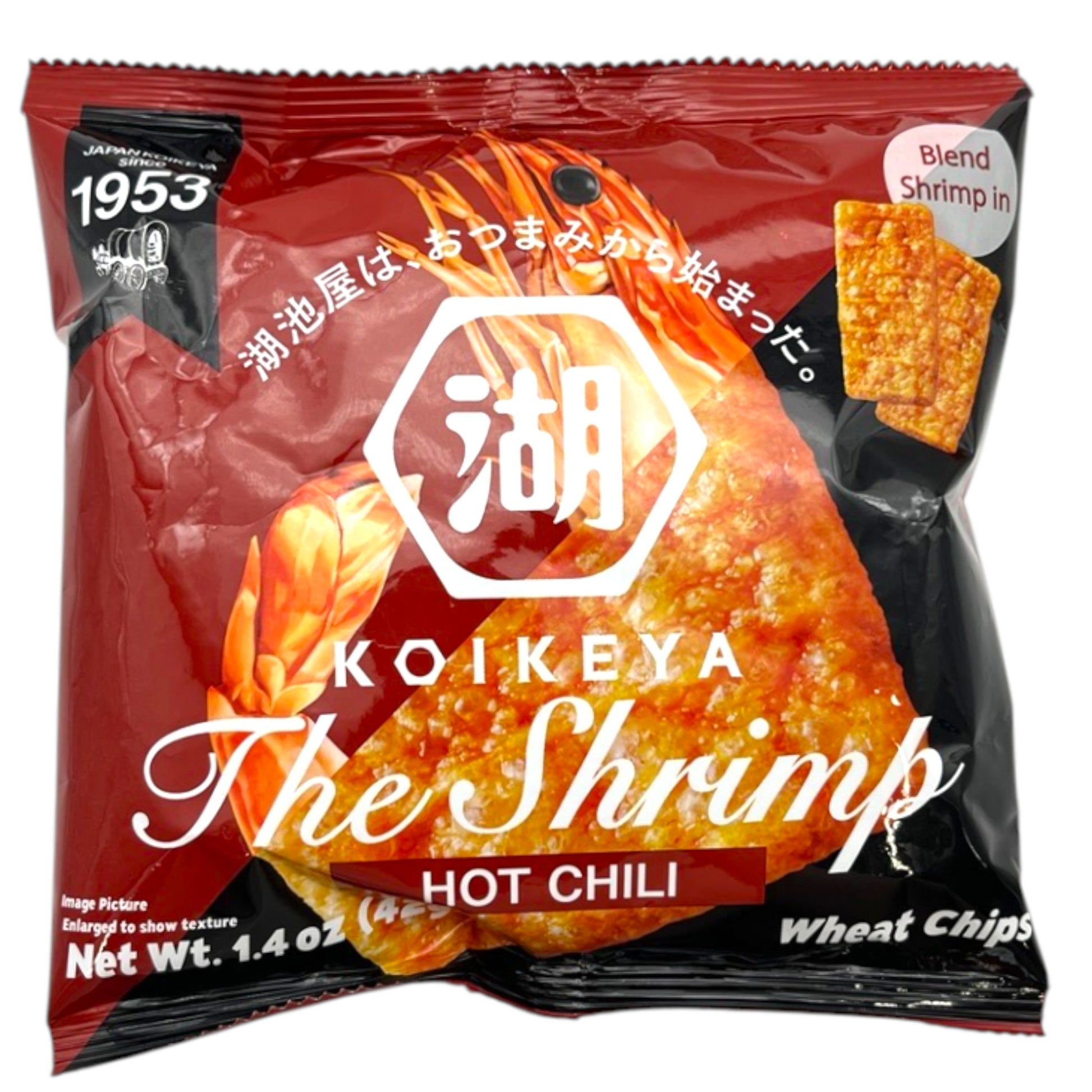 Experience the irresistible crunch and fiery taste of Koikeya The Shrimp Hot Chili Wheat Chips—a snack with a kick of spice and seafood umami.