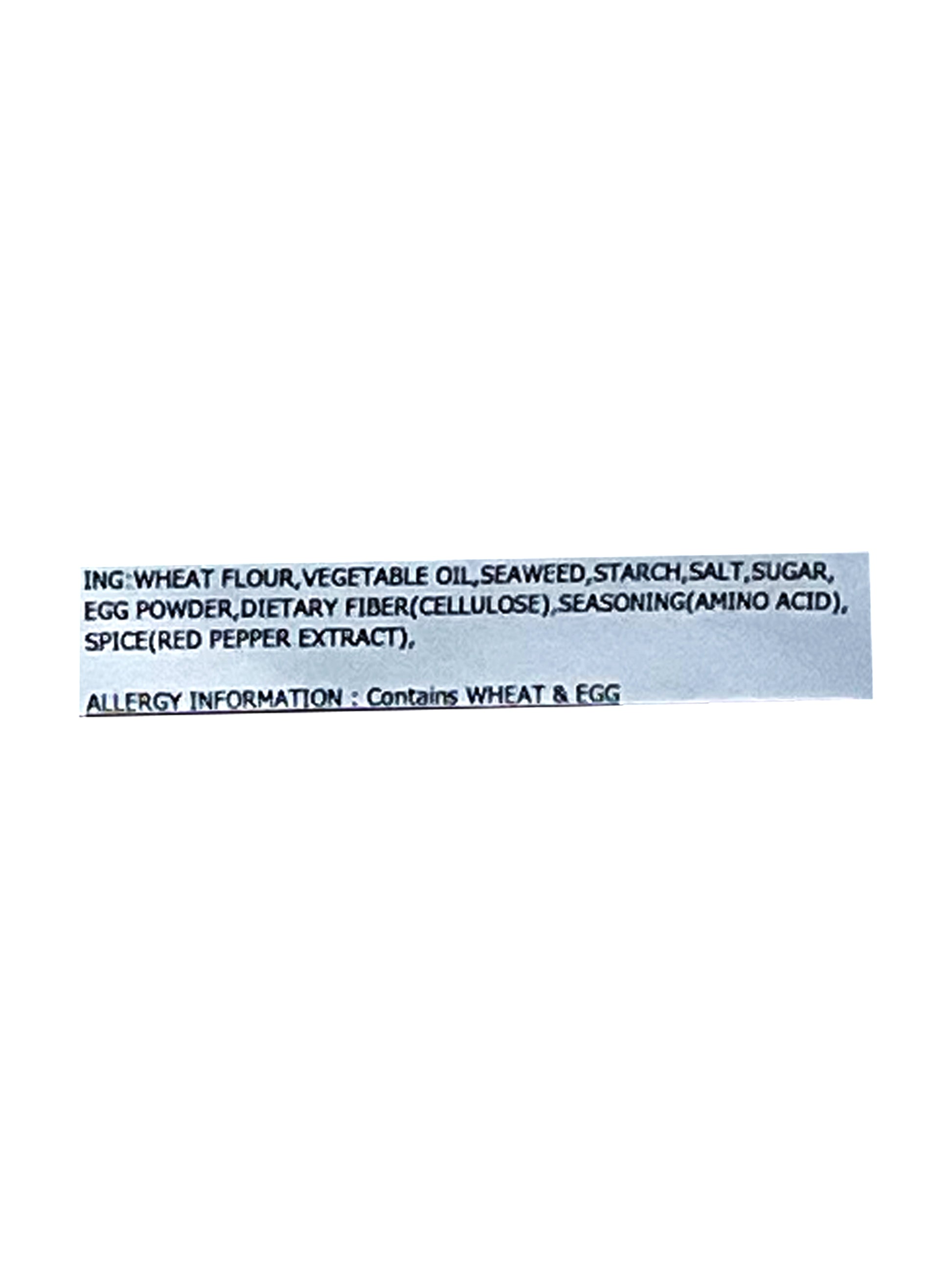 Main Ingredients: Wheat flour, vegetable oil (such as soybean, rapeseed, sesame, palm, or rice bran), seaweed (nori), starch, sugar, wasabi spices (for wasabi flavor), egg white, spices, and seasonings.