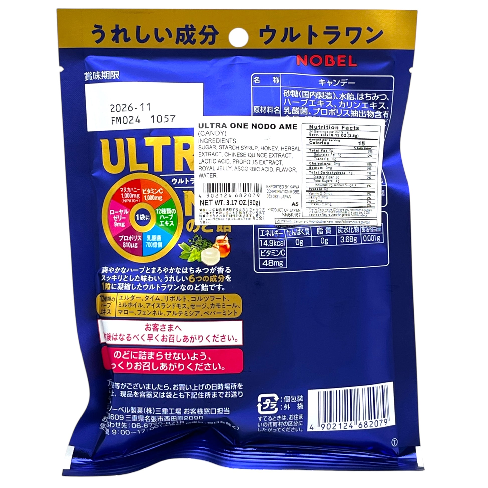 Nobel Ultra One Nodo Ame Candy 3.17 oz is a soothing Japanese hard candy designed to help relieve throat discomfort. Each piece combines a mild sweetness with a gentle cooling sensation, perfect for enjoying anytime you need a soothing treat.